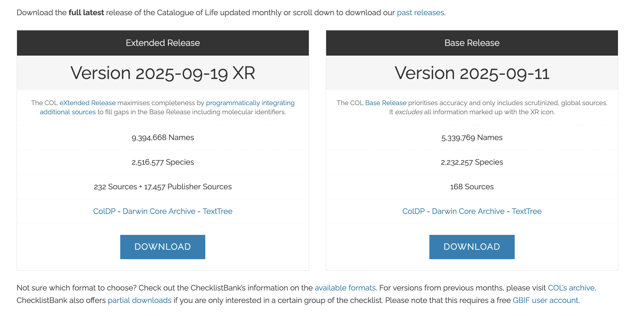 The Catalogue of Life includes information with different gradients of quality. It now comprises two releases. The base release is verified by taxonomic experts specifically for COL. The eXtended Release includes extra data from other sources. The latter is now the default in catalogueoflife.org.