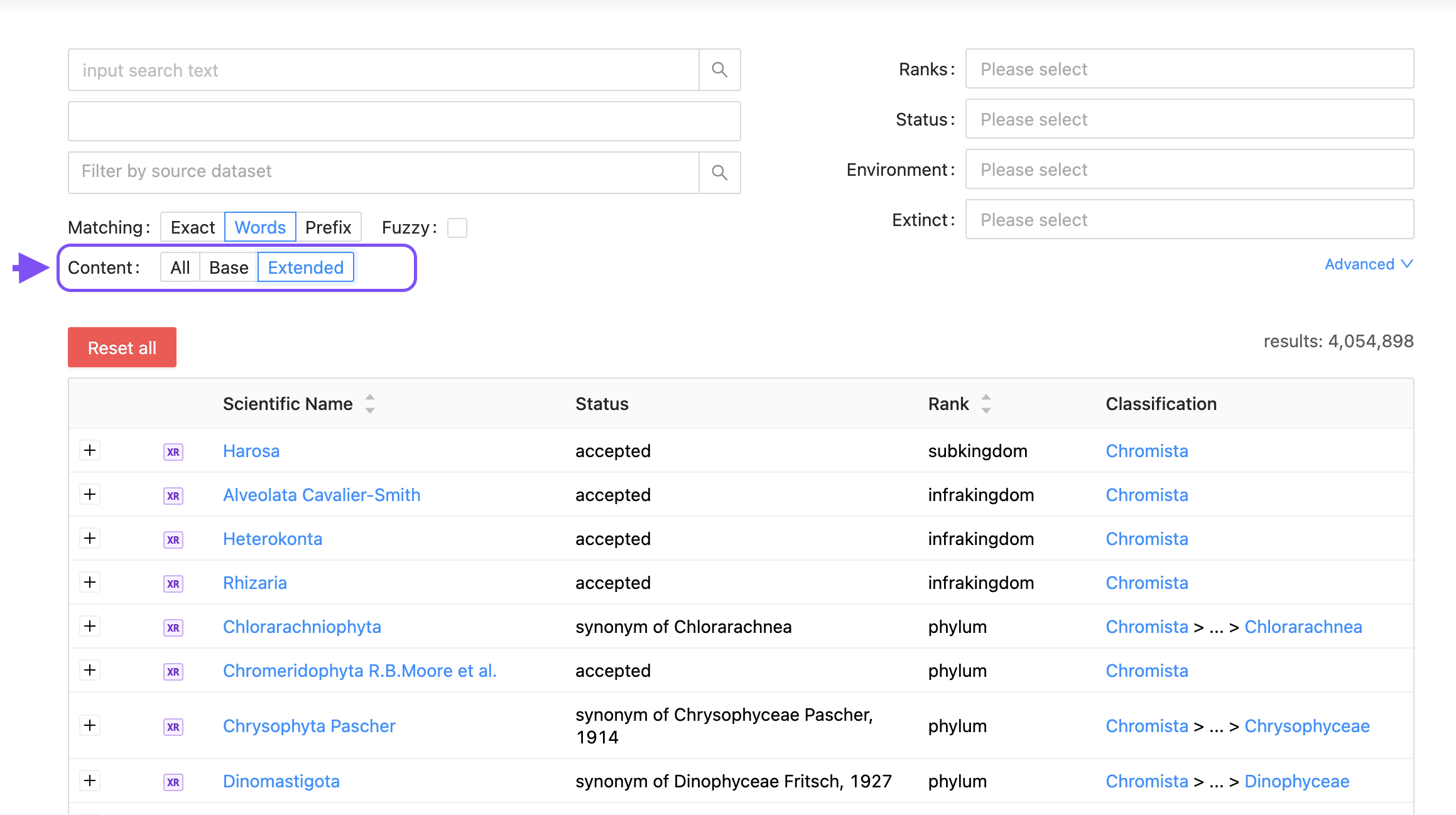 - Browse view: Shows the COL eXtended Release merged names marked with the XR icon. Thus you can identify which names come from vetted sources and which from the additional sources (regional, national, and management checklists among others).